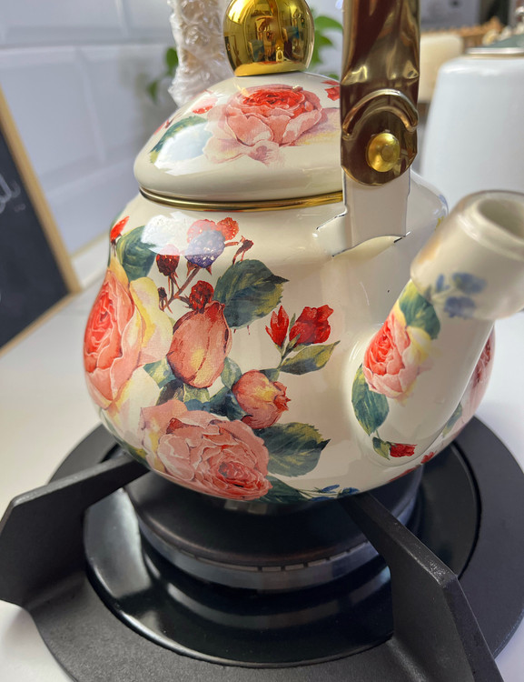 طرح گلدار بدنه، حس نوستالژیک و سنتی ایجاد میکند و آن را به گزینهای ایدهآل برای جهیزیه عروس، دکور آشپزخانه کلاسیک، یا سرو چای در مهمانیهای خاص تبدیل میکند. دسته استیل طلایی رنگ ثابت علاوه بر جلوه لوکس، در برابر تغییر رنگ و کدر شدن مقاوم بوده و هماهنگی زیبایی با بدنه لعابی ایجاد میکند.